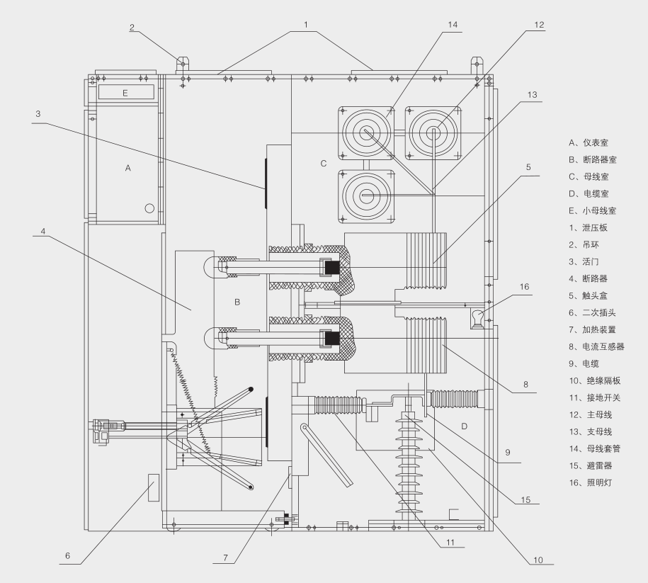 ◆开关柜结构GB3906-2006和IEC298中铠装金属封闭开关设备标准而设计,整体由柜体和可抽出部分(手车)两部分级组成。柜体结构为组装式,用螺栓栓接组合成型,用金属隔板将开关柜体内部分隔为断路器室、主母线室、电缆室和继电器仪表室。外壳防护等级达到IP3X,各隔室间防护等级为IP2X,并且所有金属结构件可靠接地,主回路系统的隔室间有独立排气的压力释放通道。