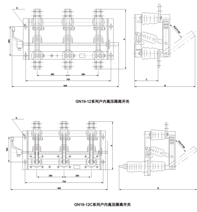 GN19-10,10C/400,630,1250型户内高压隔离开关适用于交流5Hz,额定工作电压6,10kv,额定工作电流200,630,1250A的电力系统中,作为有电压无负荷情况下的分断,闭合电路的户内开关设备使用.